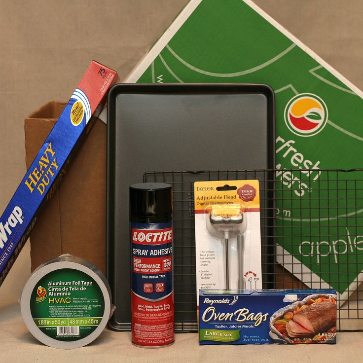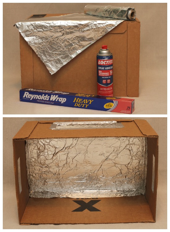 Cover the box completely with aluminum foil inside and out. This works best by spraying the box first with adhesive, attaching foil, and securing with the foil with the aluminum tape. Cover the box well, making sure none of the cardboard is showing so it doesn’t burn. Also note, be sure to cover the box with the foil shiny side out, so it will reflect the heat better. The matte side should be what you stick to the box.