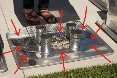 Place a sheet of heavy-duty foil (make sure the sheet is longer than your box), shiny side up, on level ground or use a baking sheet. Space soda cans on the foil/baking sheet to support the cooling rack. Position the cooling rack so that only the very corners are resting on the soda cans. Check to make sure the cans aren’t spaced too far apart to prevent the box from fitting over them. You can regulate the temperature of your oven by the number of briquettes you put in it. One briquette equals approximately 35 degrees F(ie. for 350 degrees, use 10 charcoals). Using tongs, place hot briquettes on foil, spreading them out evenly between the cans and along the edges. Don’t pile all of the briquettes in the center because your food will burn. Place them around the edges exactly where the red arrows are pointing at in the image below.