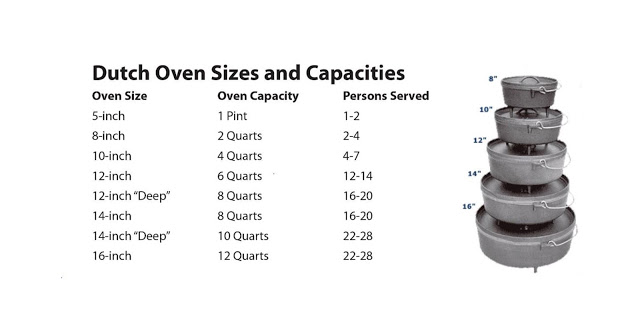 The size of your dutch oven matters. It determines how much food you can cook and how many charcoals you’ll need to heat your food. The chart below explains dutch oven sizes and capacities to help you decide which size will be best for your needs.