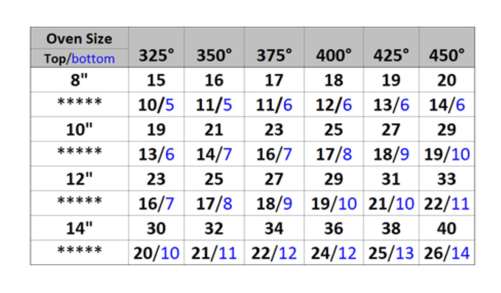 How do you know how much charcoal you’ll need? For Dutch oven cooking, use the oven size in inches plus 3 briquettes on top and the oven size in inches minus 3 briquettes on the bottom for 350-375 degrees. The chart below shows how many charcoal briquettes you’ll need for the size of your dutch oven.