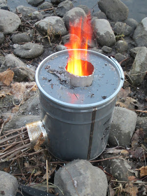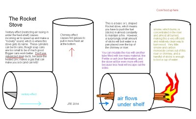 The great thing about rocket stoves is that they use 18-35% less fuel compared to traditional stoves. To make your own rocket stove from a #10 can, click here. To make your own rocket stove from cinder blocks, click here. To see a few other rocket stove plans, click here or click on the image below.