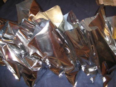 Once your bags are full, place an oxygen absorber into each bag. Wipe any dust or residue off the bags so they’ll seal properly. Fold the edge of the bag over and seal with a clothing iron or flat iron(hair straightening tool).