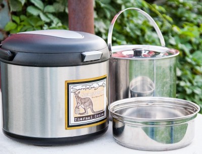 A thermal cooker is basically like a giant thermos. To cook food in a thermal cooker, remove the inner pot. Place your food inside the inner pot and bring it to a boil on a stove. If you have electricity/gas, you can bring it to boil on your regular stove, if not, use a butane stove, alcohol stove, backpacking stove, kerosene stove, propane stove, jet boil, rocket stove or volcano cooker to boil your food. When the contents of the pot has boiled for 3-10 minutes (depending on your recipe) place the lid on the inner pot and place the inner pot inside the thermal cooker. Once you shut the lid to the thermal cooker, your food will cook until it’s done, without using any more fuel!