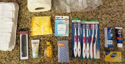 bar soap, kleenex, floss, baby shampoo, hand lotion, sunscreen, toothpaste, toothbrushes,