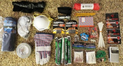 trash bags, N95 dust masks, duct tape, small tarp, paracord, safety goggles, split leather gloves,