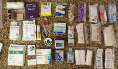 basic first-aid guide, moist towelettes, anti-septic towelettes, latex gloves, acetaminophen, ibuprofen, aspirin, benadryl, Imodium A-D, burn cream, sting relief towelettes, hydrocortisone cream, triple antibiotic ointment, cough drops, earplugs, instant ice pack, tweezers, nail clippers, scissors, digital thermometer, cotton balls, waterproof adhesive tape, gauze rolls, gauze pads, moleskin, bandaids, butterfly bandages, ace bandage, triangular bandage, hand sanitizer, Q-tips, petroleum jelly, RAD sticker (personal radiation dosimeter), potassium iodide (radiation emergency thyroid blocker)